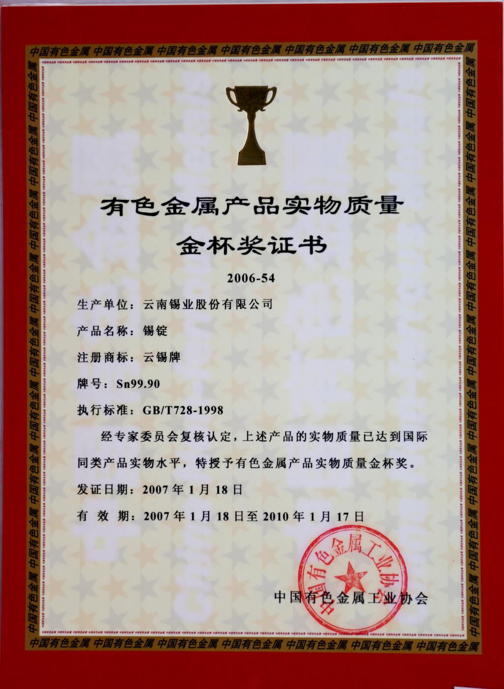 云錫牌錫錠獲有色金屬實物質(zhì)量金杯獎