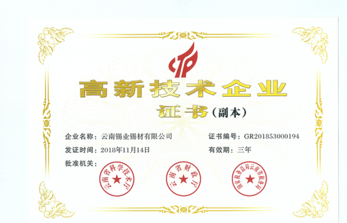 2018年,錫材公司經(jīng)過評(píng)審、公示,再次獲得認(rèn)定,取得“高新技術(shù)企業(yè)證書”。自2009年錫材公司首次申報(bào)高新技術(shù)企業(yè)并獲得認(rèn)定開始,已連續(xù)四次申報(bào)成功,一共連續(xù)12年位居高新技術(shù)企業(yè)之列。