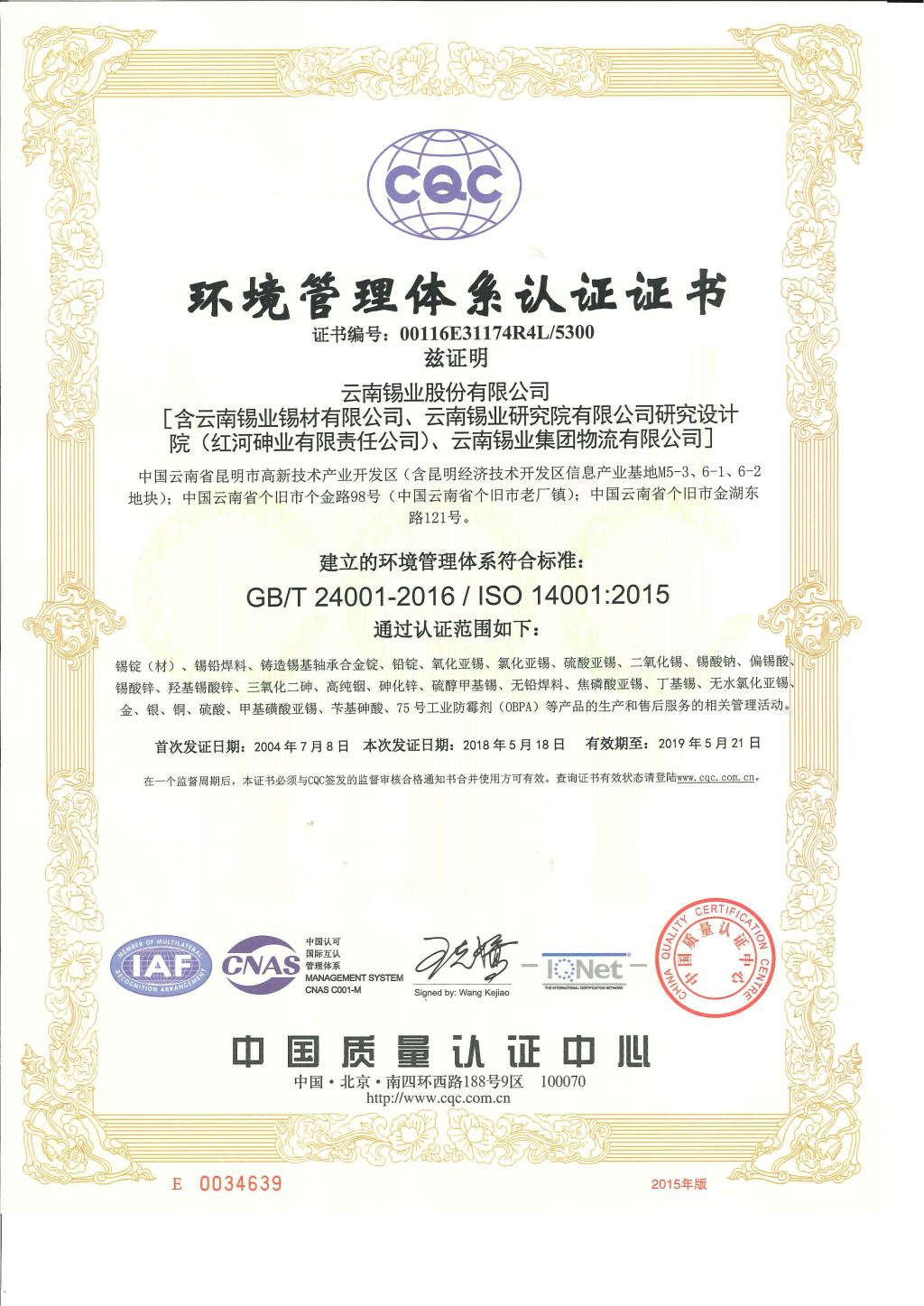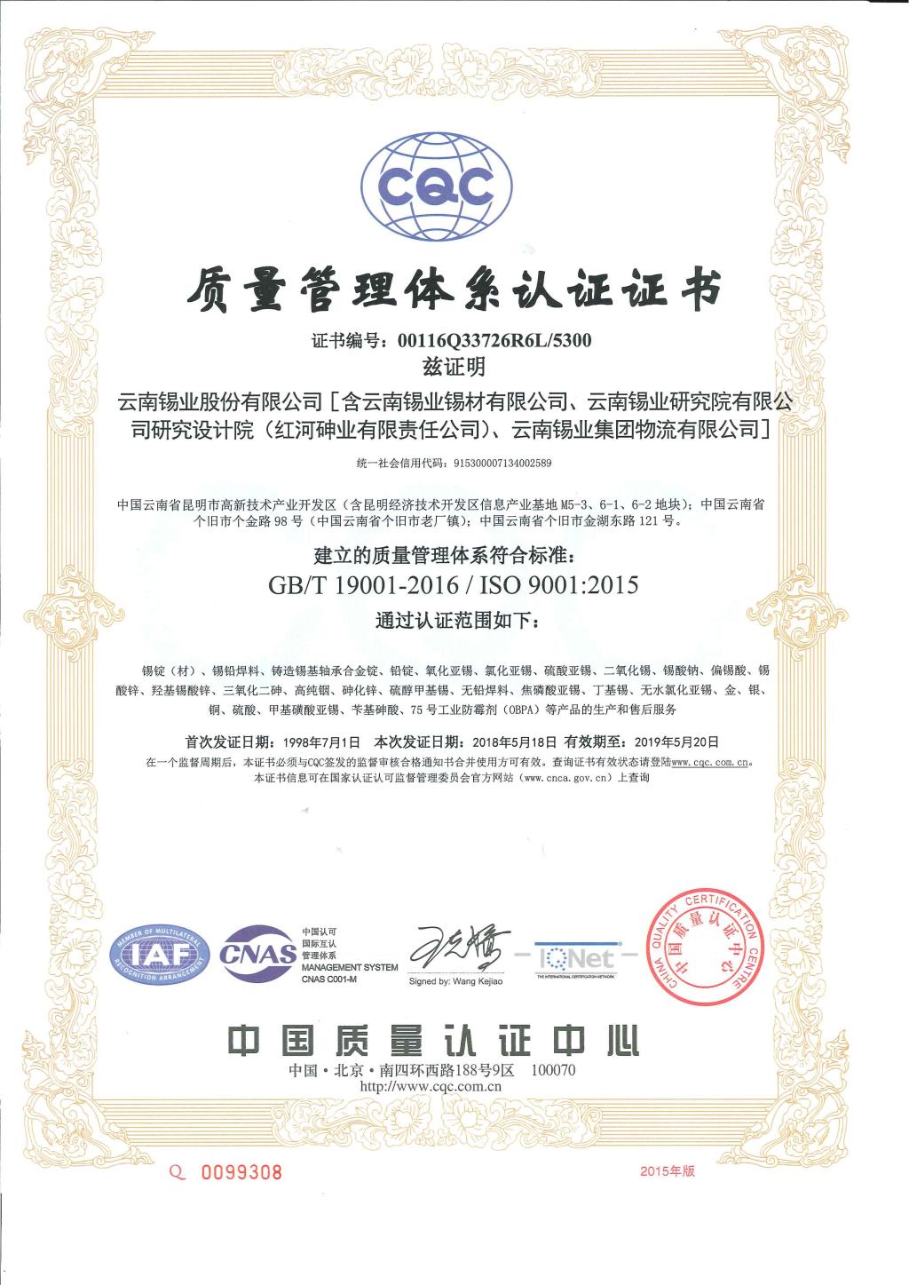 近日,錫業(yè)股份質(zhì)量、環(huán)境管理體系通過新版ISO9001:2015、ISO14001:2015標(biāo)準(zhǔn)換版認(rèn)證審核,職業(yè)健康安全管理體系通過OHSAS18001:2007標(biāo)準(zhǔn)年度監(jiān)督審核,獲得證書。