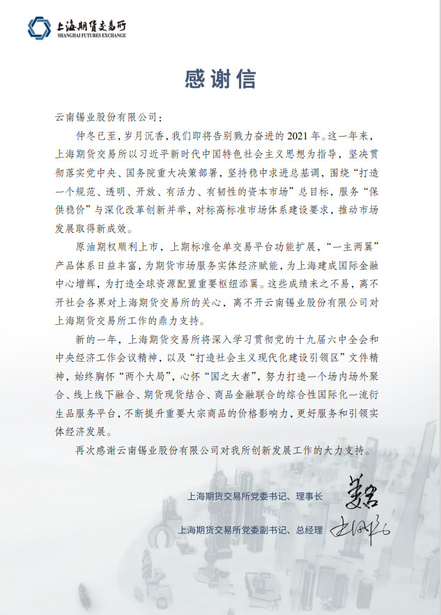 2022年的市場(chǎng)環(huán)境更趨復(fù)雜嚴(yán)峻和不確定,回顧2021年與上期所風(fēng)雨同舟,我們展望2022年與上期所進(jìn)一步加強(qiáng)合作,推動(dòng)錫產(chǎn)業(yè)高質(zhì)量發(fā)展再創(chuàng)輝煌。
